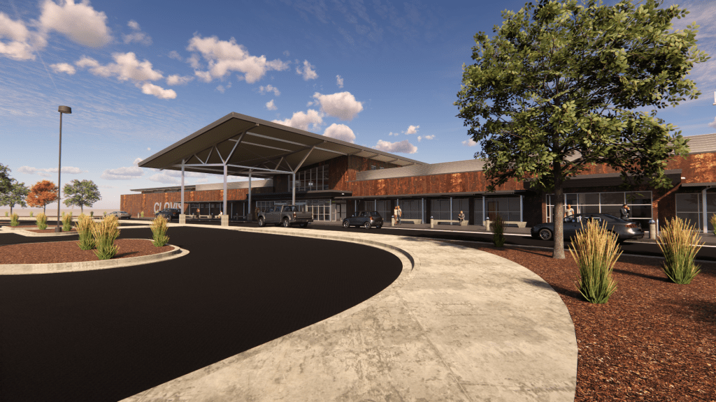 The new terminal building will include check-in desks for airlines and car rentals, a restaurant, baggage claim, ample passenger seating, and additional parking.